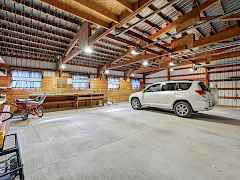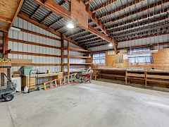 Welcome home to your private 6.5-acre retreat! This sprawling 3,000+ sq. ft. haven features 5 oversized bedrooms and 2 beautifully appointed baths. Vaulted ceilings crown the open-concept living, formal dining, and wraparound kitchen complete with double ovens, cooktop, bar seating, and a premium water filtration system. Gather around the 5-year-old pellet stove as natural light pours in thru every window. The primary suite addition impresses with a huge walk-in closet, 4-piece spa bath, and double doors leading to a serene brick patio. Enjoy main-floor laundry, abundant storage, and a mudroom leading to fenced gardens and pastures ready for pets or livestock. A 3-stall barn, oversized 3-car garage with carport, and 72x32 heated shop with roughed-in bath make this a dream for hobbyists.